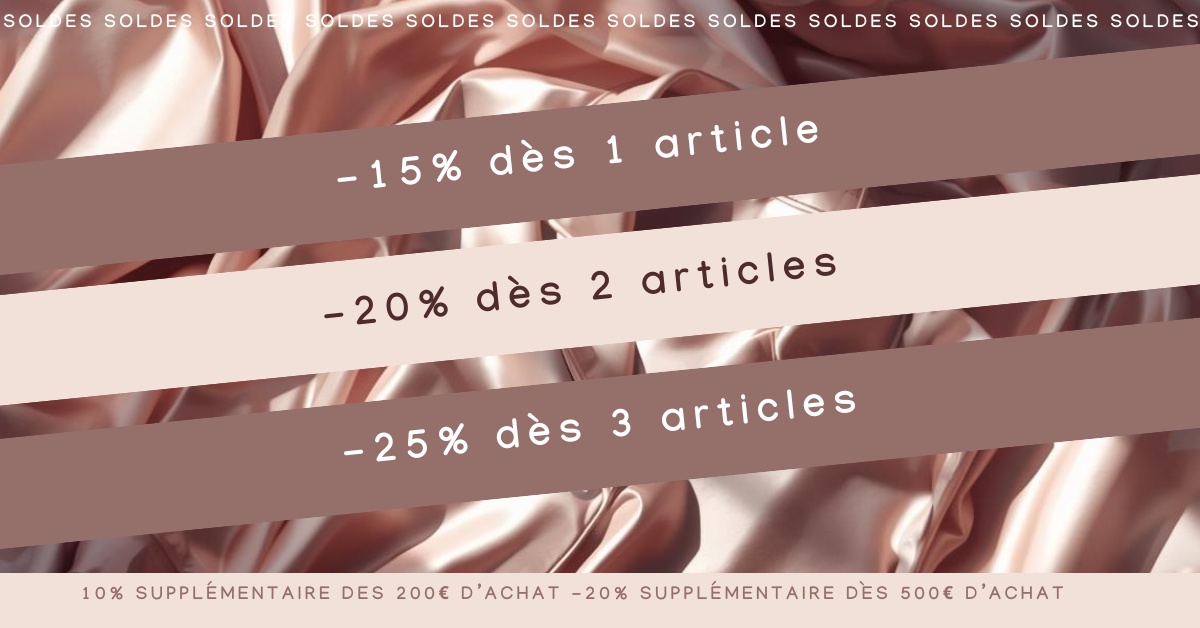 Soldes : 1 produit acheté -15% / 2 produits achetés -20 % / 3 produits achetés -25% ..............................10% supplémentaire dès 200€ d'achat .................. -20% supplémentaires des 500€ d'achat